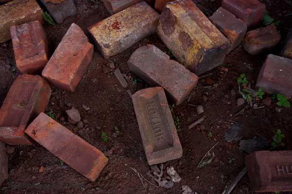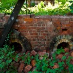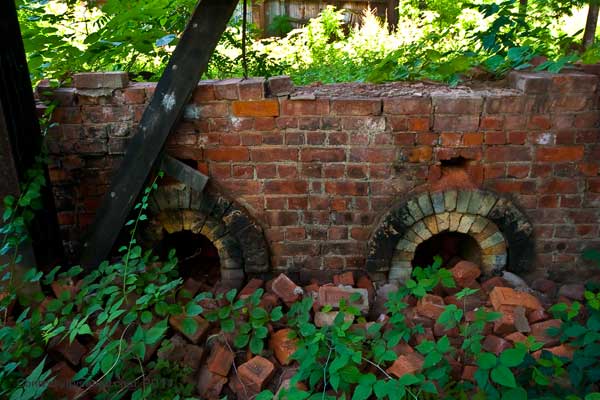 Further back were the drying sheds, and large (brick, of course) ovens were the clay was heated and molded. Several of the old narrow gauge tracks are still embedded in the concrete here. these are some of the only traces of the railway here. There doesn’t seem to be any record online as to what happened to the 2 old locomotives and the clay hauling cars, though I did find this photo of what looks like one outside an abandoned restaurant in Oneonta. (This restaurant is currently listed as for sale).