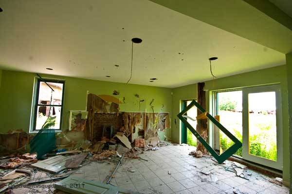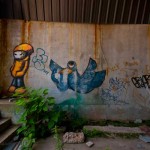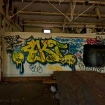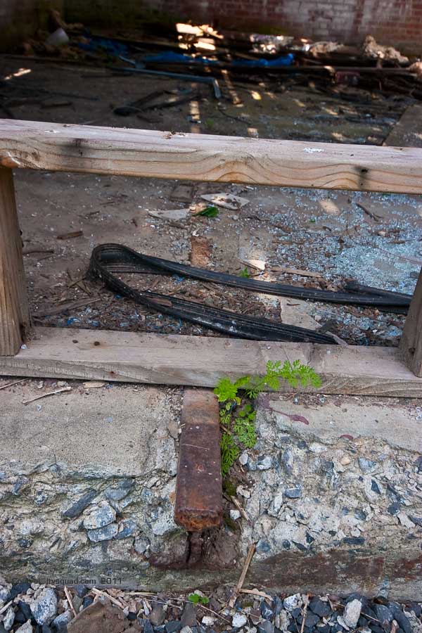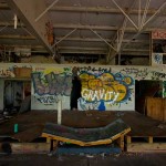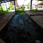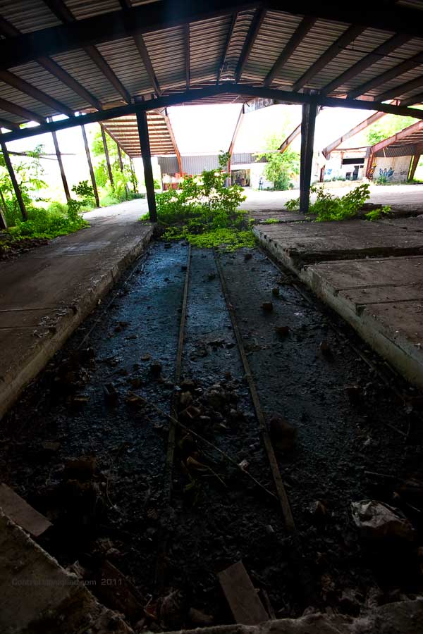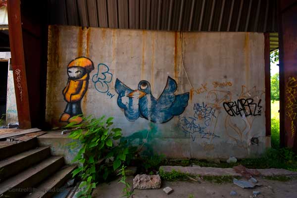 Most of the buildings here have been gutted of equipment. Anything metal was looted long ago by scrappers. Curiously, a building towards the river was re-purposed as a restaurant, which later failed. Here is where local kids have set up skateboard and dirtbike ramps. Several were building a new obstacle coarse as we wandered through – not bothered at all by our presence.