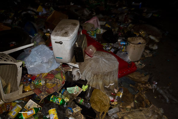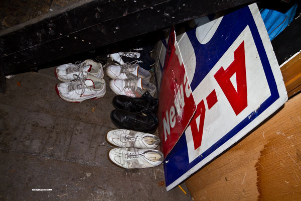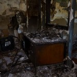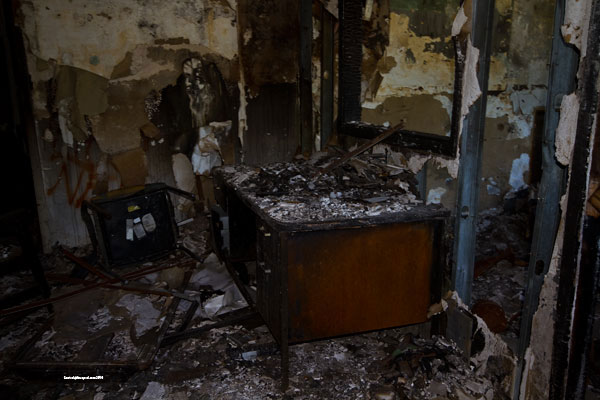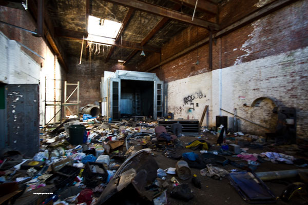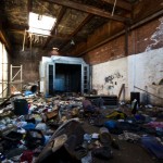 At present time, it’s a shithole. Squatters abound, the parts of the building that are not a burned out mess are filled with trash. Here lay the possessions of heroin addicted squatters, who have cobbled together piles of shoes, clothing and pure crap – strewn across the floor in random piles.