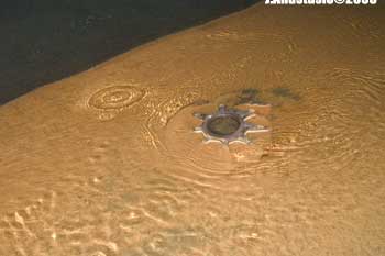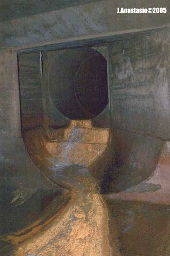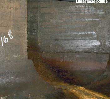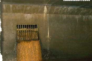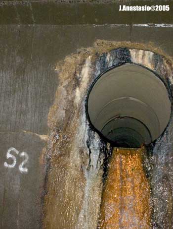 the first time I ever entered this drain, it was a cold rainy day. The water level was far too high to navigate this tunnel without ending up with some very cold very wet feet. So we came back one night when it was a little dryer, and found that despite the absolute blackness of this tunnel (no lights anywhere, no lights coming in from the manholes above), the tunnel was not without color. The bottom of the tunnel floor was thick with a golden brown sediment, perhaps some type of soil that had run off into this drain from some of the pipes and smaller drains that feed into this very large (and very smelly) drain. -