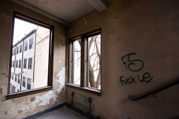 This one was such a bitch to get into for some reason. You’d think that first thing in a sunday morning you wouldn’t run into cops, cable guys, and trash dumpster guys, all lingering around said location doing absolutely nothing… but that’s how it was…So after waiting these lameos out we finally got to barge right in. From a photography perspective I’m pleased with the results, but adventure wise, this place wasn’t really worth the wait. Gutted & beat up, this old hospital has seen better days. Judging from the trash bin removers and the utter lack of windows in this building, chances are it’ll be seeing a new life as some form of housing soon enough.