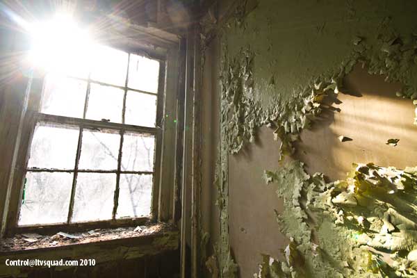The hospital stood on top of a small hill – above the street and hidden behind trees. The elegant arched driveway leading to the front door immediately told of the building’s former glory, while the trash piles and weeds signaled a lawless area. We approached the side entrance, and were slightly surprised to find no existing access here. Circling around back seemed like a maze of trash and debris, so instead we went back around front to scout it out some more before locating a suitable climb up and in spot (second floor windows were open).