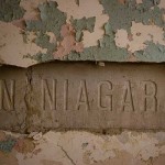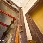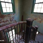 We regroup outside, not content to depart just yet. It’s a beautiful day, perfect for getting interior and exterior photos of this building. It’s still mostly quiet out, except maybe those sirens in the far distance. This is a big building, and no one outside of the one lady seemed particularly offended by our presence. The kindly old grandfatherly man who we originally encountered has reappeared outside. He approaches us and soon we’re talking about the building. Indeed, he and many others are living inside. He starts pointing out the corner stone, engraved with the date the building was constructed, along with survey markings on the driveway, left by a demolition crew recently as they prepared a plan to presumably take this building down. He starts telling us a bit about himself, and it’s plain to see this 60 something older man had nothing better to do but to give us a both a tour of the building and serve as a shield against the residents assuming we were there for any reasons that might negatively impact their rent-free den of disorder.