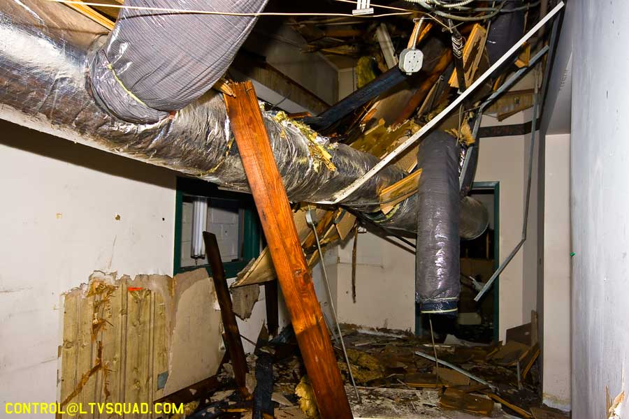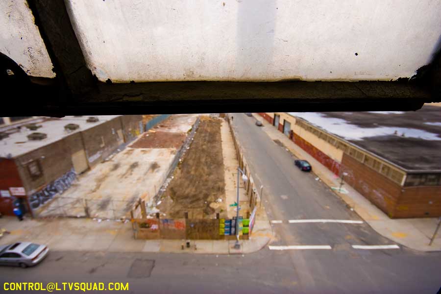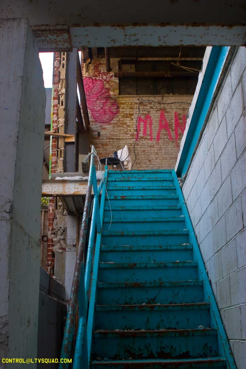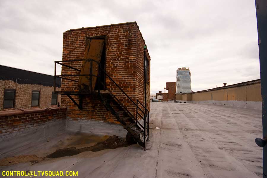 There’s something inherently funny about walking up the front stairs of a building and looking out onto the street below (because there are no walls up here anymore) – especially when that street is full of people going about their lame ass boring lives. There was but a sheet of plywood between us and them, but when you think about it, it may as well have been the great wall of china. This is the barrier between those who explore and those who will never understand the pleasures of crossing lines, physically and mentally.Beyond the thrill of the location, this building offers absolutely nothing.