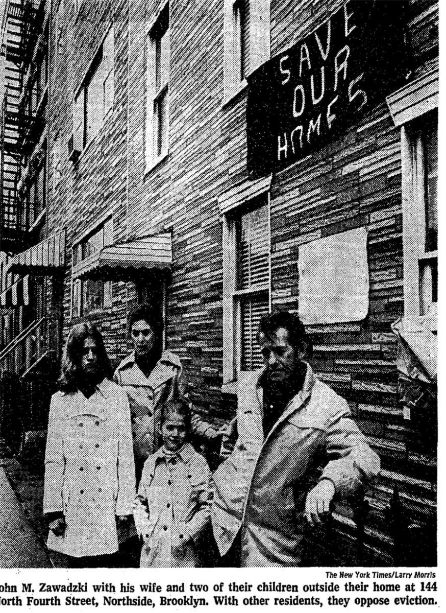 In 1973, the entire block of North 4th street between Bedford and Berry was the scene of protests and destruction dealt by the scandalous hands of then NYC Mayor Lindsay. Lindsay forcefully evicted families from their homes to make way for a huge expansion of the S & S corrugated box company factory.NYC was once a very middle class manufacturing city. Over 1 million people worked here in jobs building everything from staples to light switches. S & S corrugated made machines for constructing corrugated boxes. They employed 600 people in a factory just across the street (on 4th btw Berry & Wythe) – and in 1973, NYC was losing thousands of such jobs per year. When S & S went to City Hall and told the mayor they needed to expand their factory in order to stay in Brooklyn, they devised a plot to simply kick out everyone living on the block just east of their present factory in order to build a huge new wing. The mayor, likely paid off to do so, went right along with this plan.