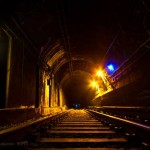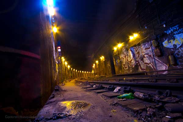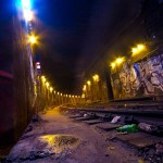 Walking right in and down along the cold hard tracks, we’re impressed by the darkness. Most subway tunnels have at least a few light bulbs. This one has nothing, for what seems like miles. It’s just you, your compadres, the darkness, and the sounds of dripping water pouring in the distance like a chorus of drunken bickering kardashians spreading their legs and rubbing their clits.